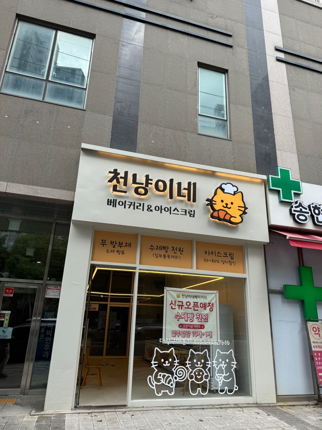 간판에 자리잡은 귀여운 고양이 캐릭터, 그리고 큼지막한 ‘무방부제 수제빵 천원’이라는 문구가 눈길을 사로잡습니다.