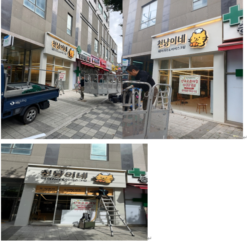 간판작업하는 모습입니다. 간판을 달고, 시트지를 붙이고 있어요. 고양이시트작업을 해놓으니, 너무 귀엽고 앙증맞죠?