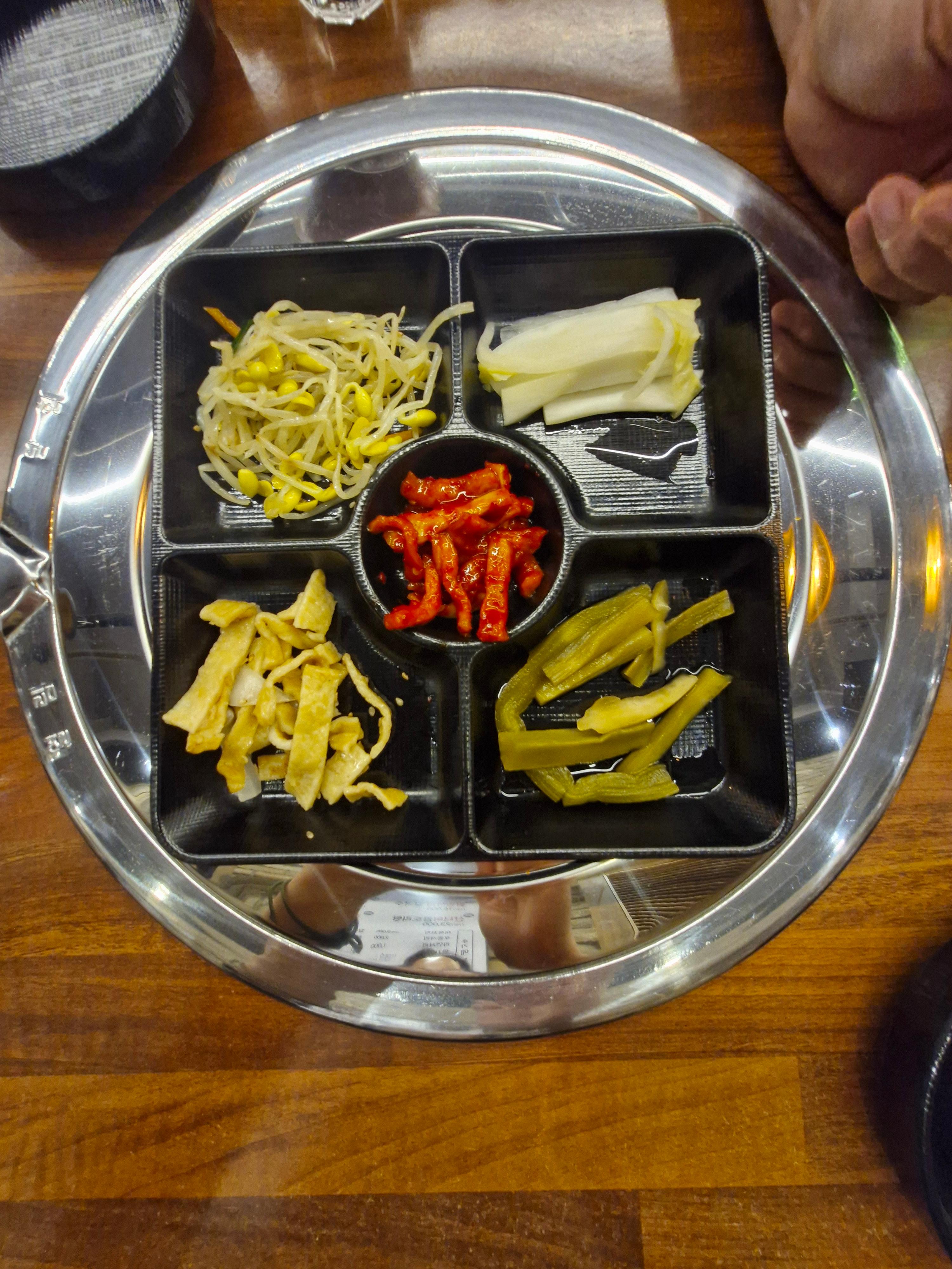 기본 반찬 셋팅된 모습입니다. 셀프바가 있어서 더 갖다먹을수 있어요.