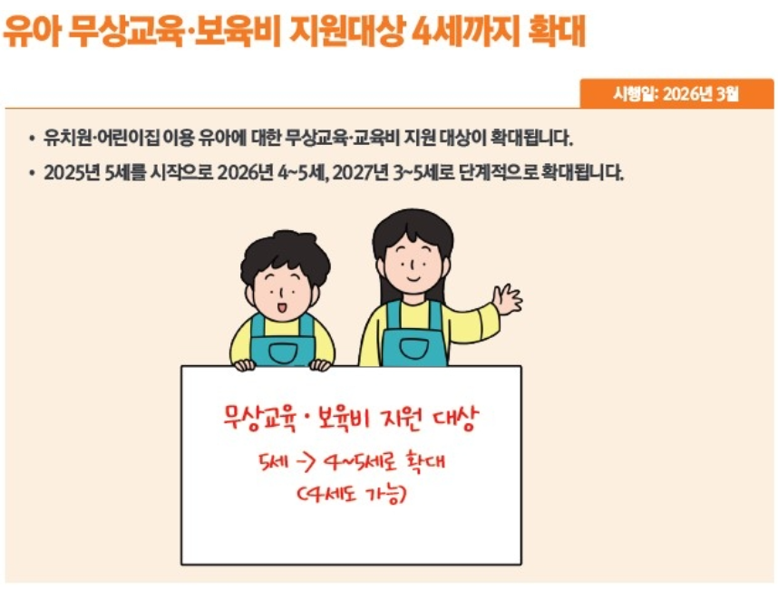 2026년 3월부터 무상교육·보육비 지원 대상이 기존 5세에서 4세까지 확대됩니다.