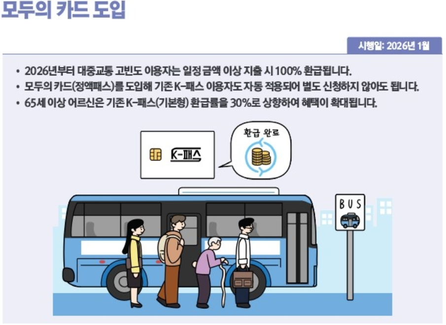 대중교통비 초과분을 무제한 환급하는 카드가 도입되며, 65세 이상 어르신 환급률은 30%로 상향됩니다.